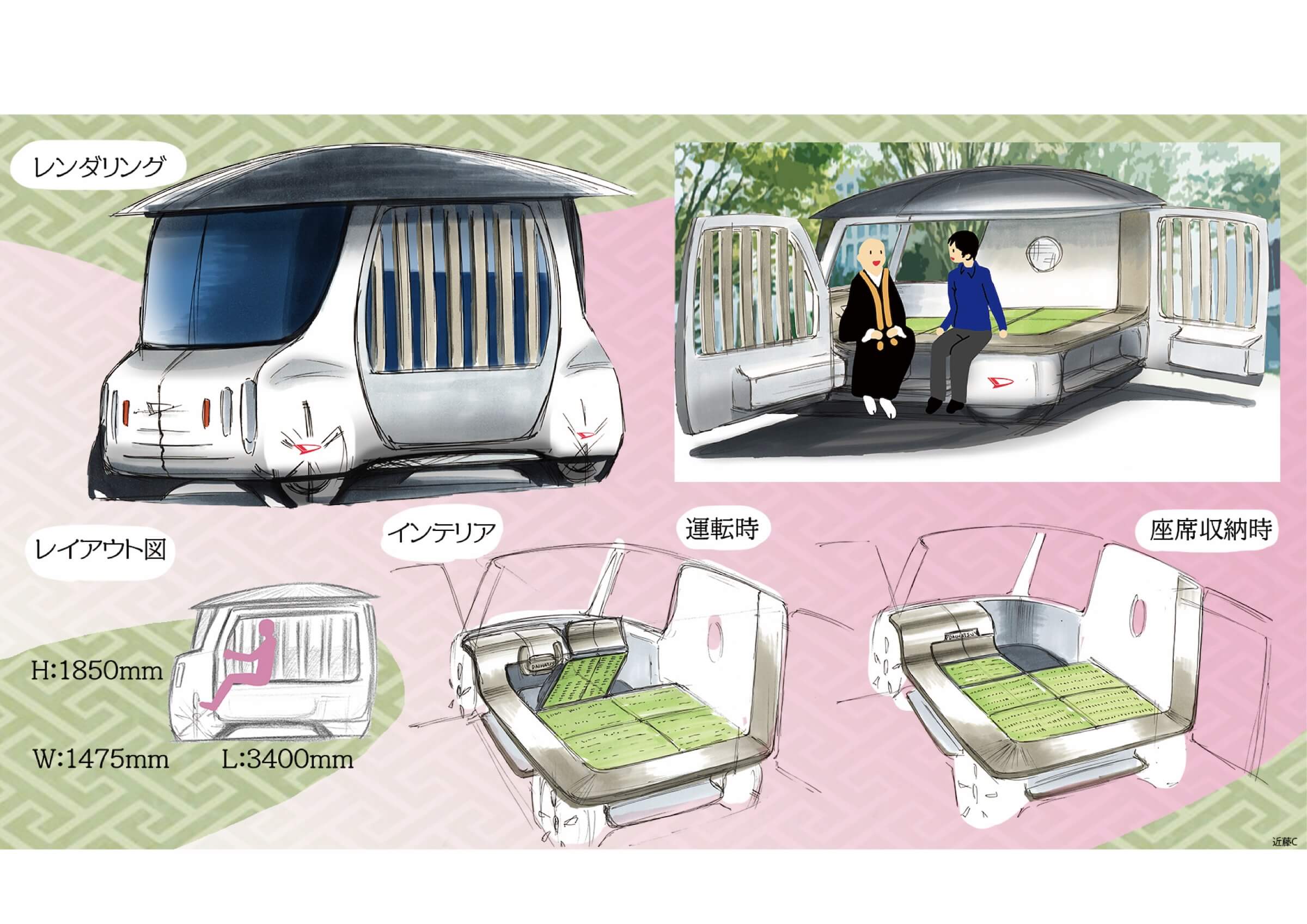 自動車メーカーから出される課題に多かったのは「身近な人物をペルソナとして設定し、その人物を喜ばせる体験価値を与える自動車を考案する」というものでした。私が提出したのは、中学から大学まで一緒だった友人をペルソナにした企画です。彼の実家はお寺で「お寺の文化をもっと広めたい」と会社を立ち上げ、YouTubeなどで発信活動をしていました。その友人をモデルに、お寺と若者をつなぐ車を提案しました。お寺には若者の檀家離れや世代間の接点不足といった課題があります。一方で、若者も人間関係が希薄になり悩みを打ち明ける場が少ない。そこで、お寺に人を呼ぶのではなく、僧侶が若者に会いに行くという発想をかたちにしました。車の中には、縁側のように人と人がゆるくつながれる空間を設け、僧侶がそこに座って若者の悩みや話を聞くイメージです。社会的な課題をデザインの力で解決できるかもしれないと感じたときはワクワクしました。