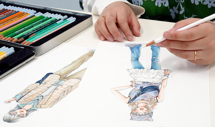 辺見:ファッション科の中にも、絵を描きたいという学生は多いですし、その先輩の二人が講師をしてくれることが心強いですね。イラストが学べる学校・講座はさまざまにありますが、クロッキーから始まって、絵の背景についてまで考えるような、一連のフローは他にあまり例がありません。加えて、先生方が桑沢のファッション科で学んだ感覚を取り入れながら、ファッションイラストを描いていくという授業方針は本当に桑沢ならではだと考えています。