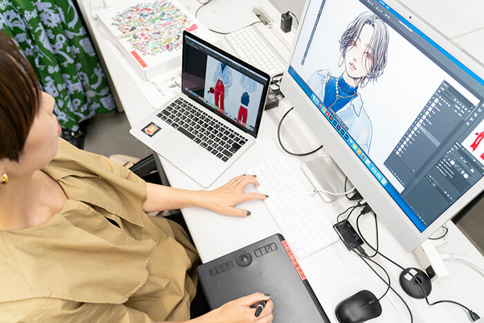 服の落ち方や素材感など「ファッションならではの視点」が、イラストの土台になります。