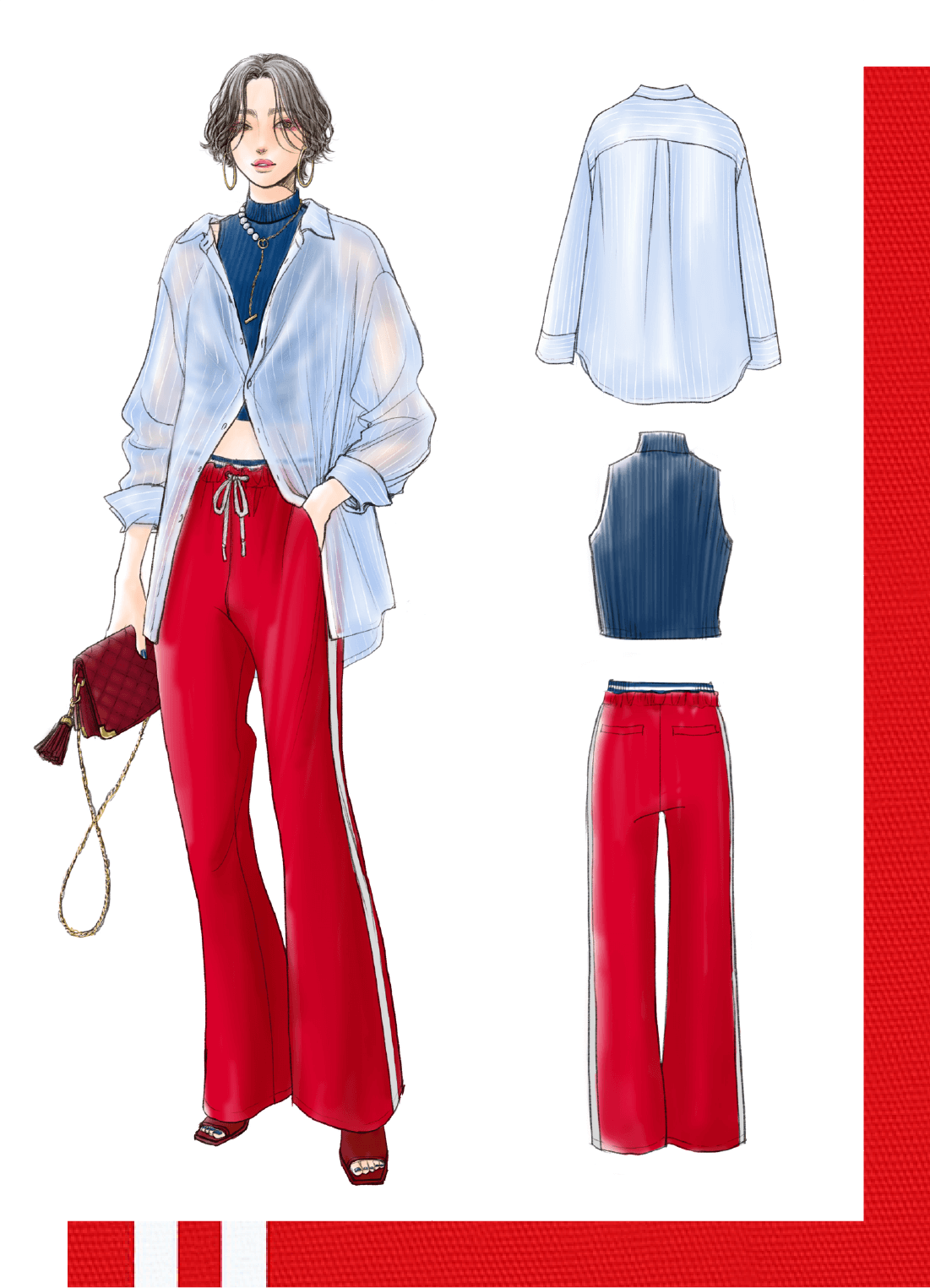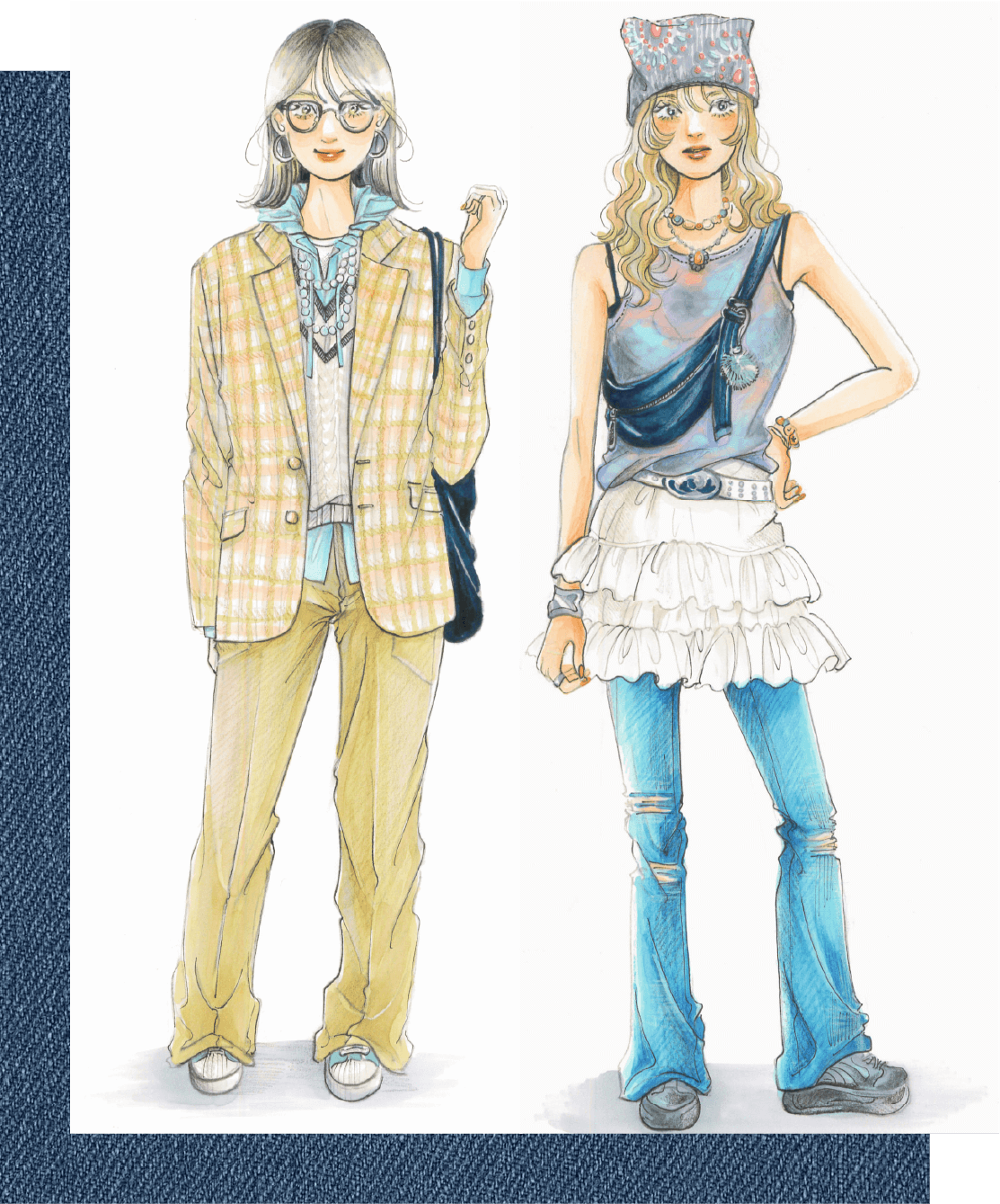 ニシイズミコスメや商業施設のメインビジュアル、美容系のお仕事をご依頼いただくことが多いのですが、ファッションもありきでお声がけいただいてるなと。トレンドが求められる場だからこそ、服装や髪型が人物像の輪郭をはっきりさせる要素になる。ぼんやりとした時代設定・イメージだけでイラストを描くだけじゃなくて、そこにファッションの知見が合わさると、より一歩踏み込んだ提案ができるのかなと感じています。