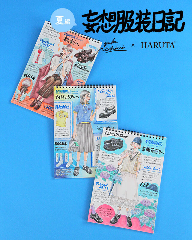 ▲靴メーカーHARUTAの連載企画『妄想服装日記』コーディネートイラスト