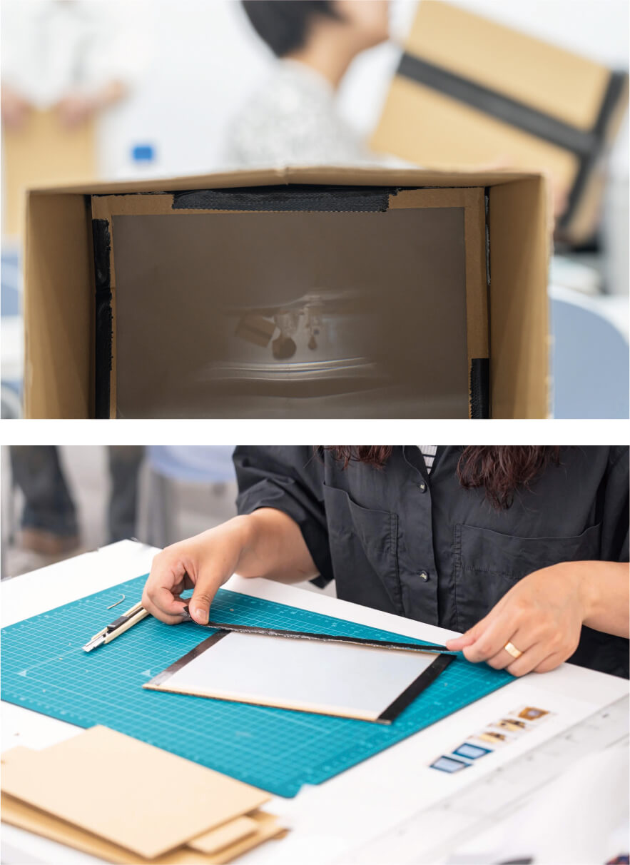 カメラの原理をシンプルな形で体験できる「カメラ・オブスキュラ」。ダンボール、トレーシングペーパー、虫眼鏡を用いて装置を組み立てると、身近な空間を新しい視点で捉えることができます。 -