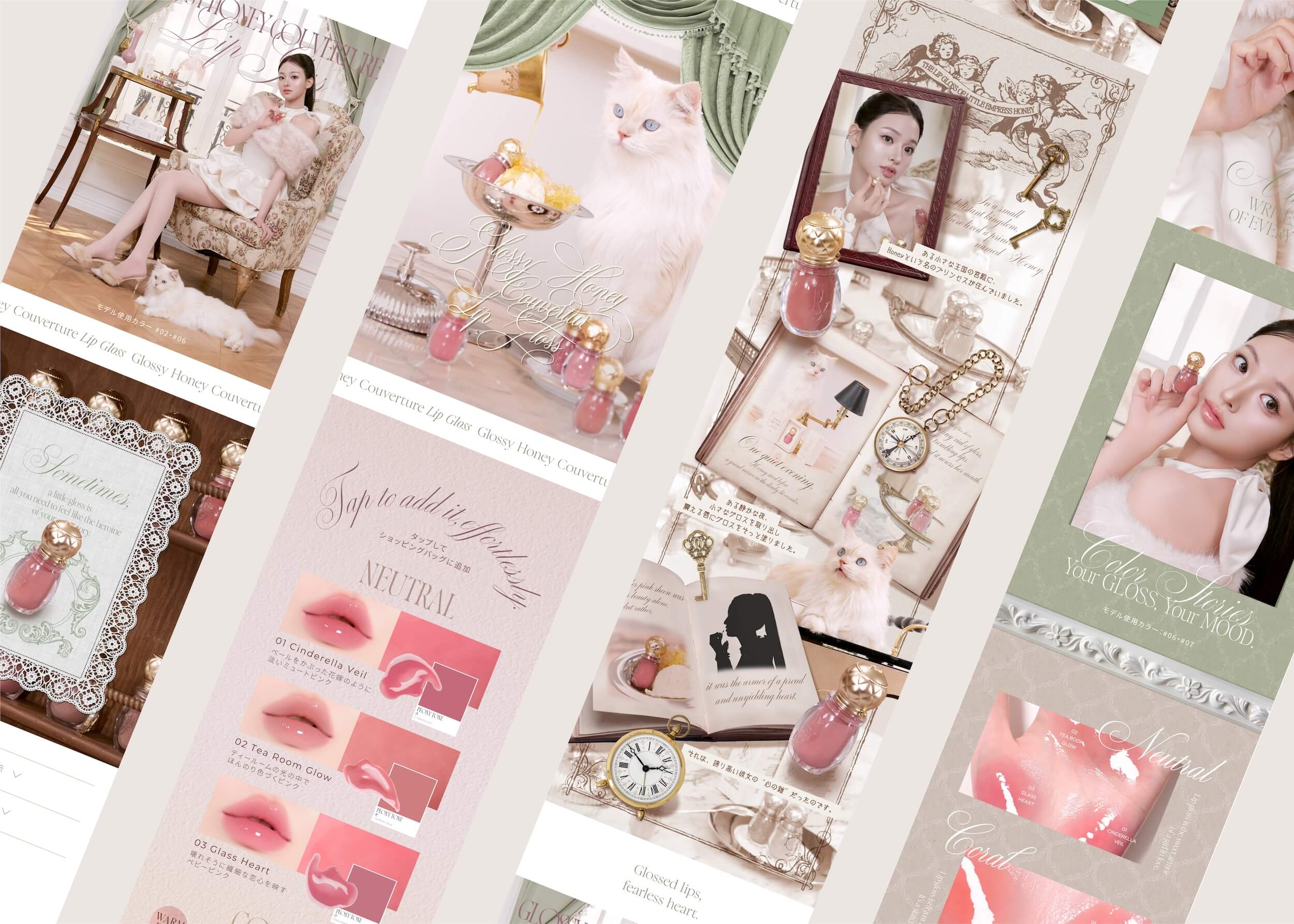 丸みのあるフォルムと、キルティングモチーフのキャップを組み合わせ、他にはない“アートピース”のようなグロス容器をデザインしました。置いてあるときはもちろん、使用する際も可愛らしく見えるよう、意識しました。