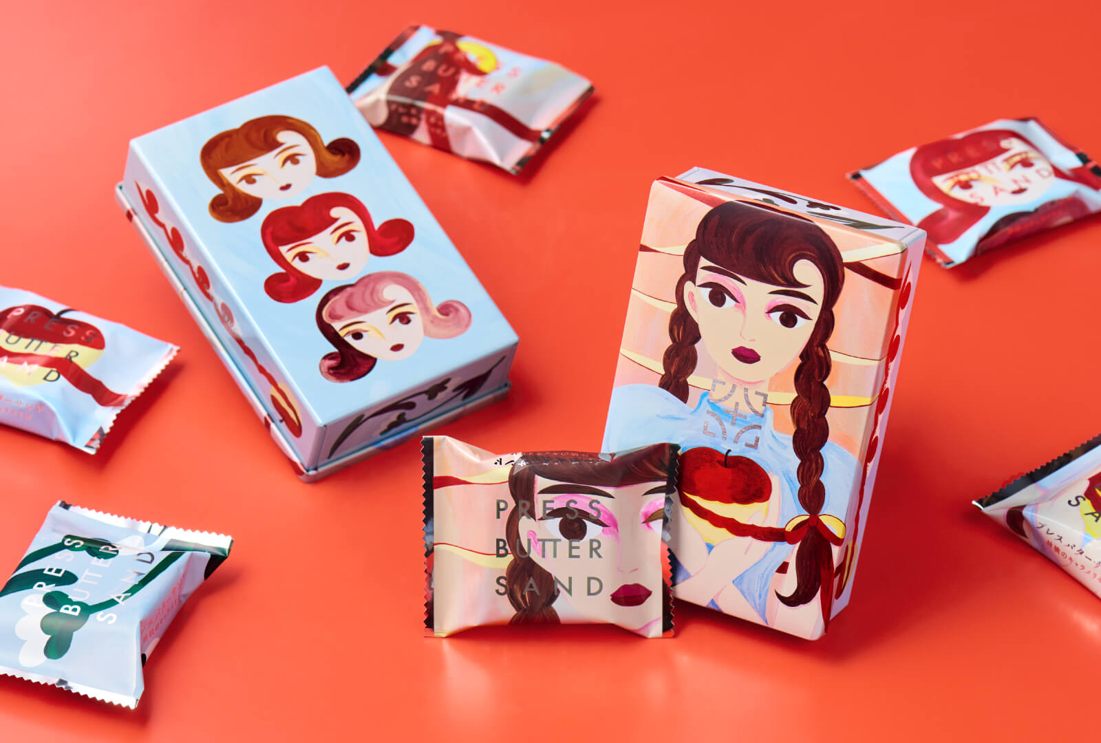 ビターキャラメル色の髪や、リボンのように絡まるりんごの皮など、風味の広がりや重なりを視覚化したモチーフが随所に施され、缶の側面や裏面にも遊び心ある意匠が散りばめられています。味わいとアートが静かに響き合うデザインです。