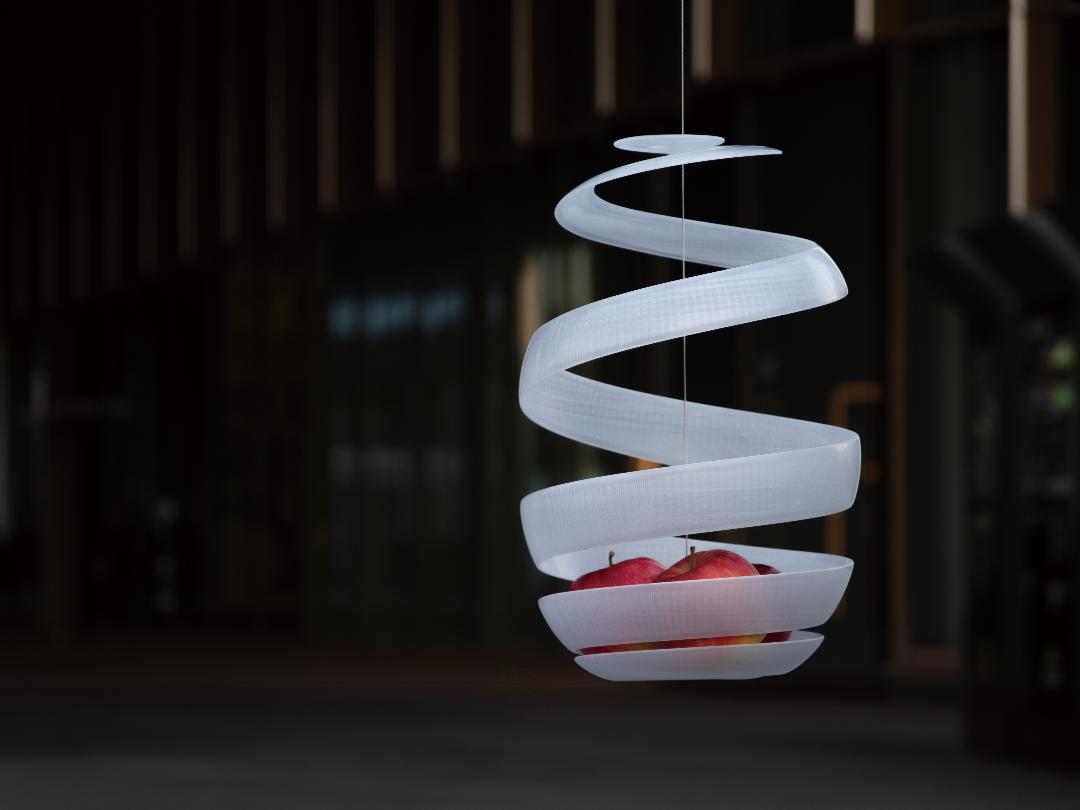 果実を包むという役割から、本体はりんごの皮をモチーフとした螺旋形となっています。3Dプリンティングによって複雑な形状を一体で成形し、素材には透明PETG樹脂を用いることで果実の色彩を柔らかく透過します。また、一度に多くの果実を支えるため、本体中心を上下に貫くワイヤによって荷重を受け止める構造を採用しています。
