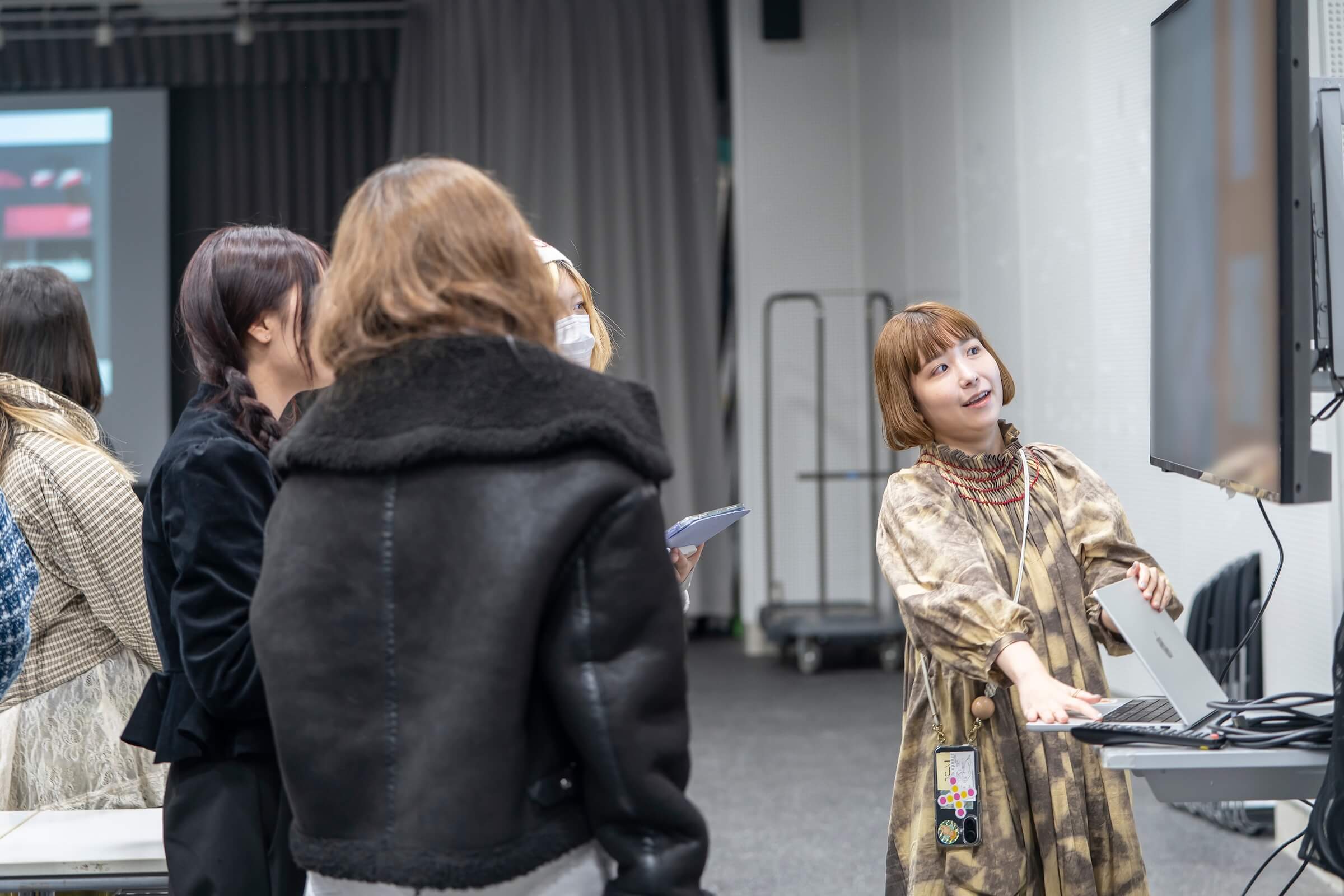 商品企画から店舗・ショーでの魅せ方、ブランドを反映した空間づくりに至るまで、桑沢での学びがどのように実務に結びついているのかを、自身の経験を交えて紹介しました。